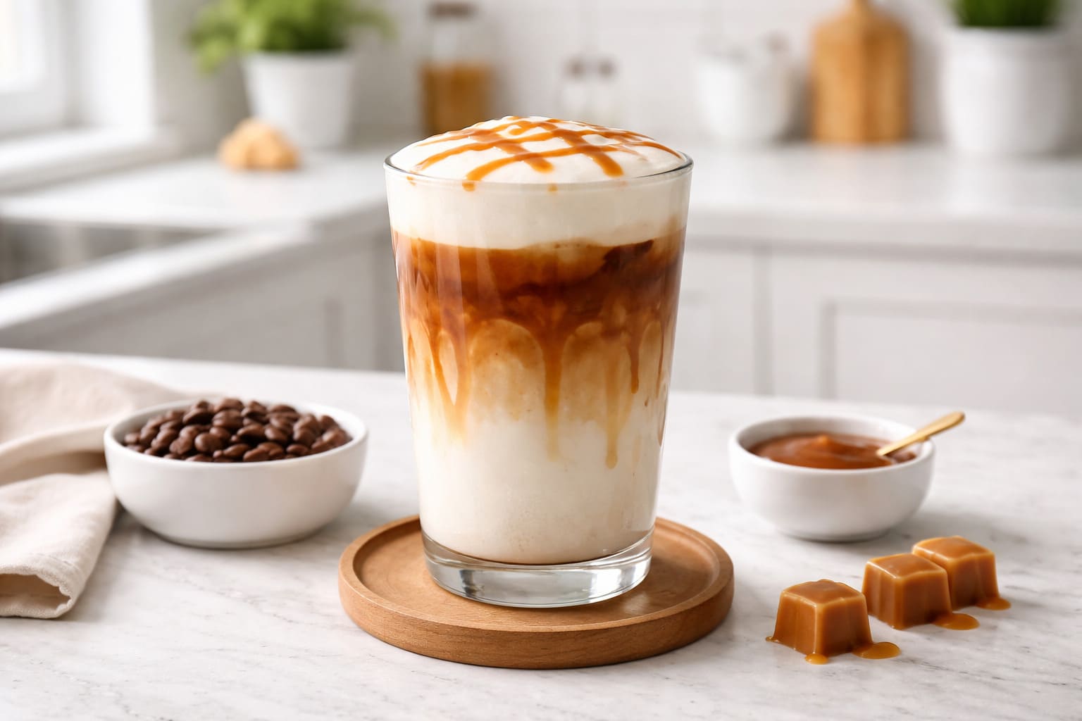 • Bước 6: Hoàn thiện: Múc phần bọt sữa còn lại đặt lên trên cùng. Rưới thêm sốt caramel (nếu dùng) để trang trí và tăng hương vị.